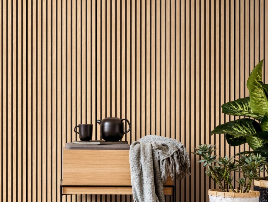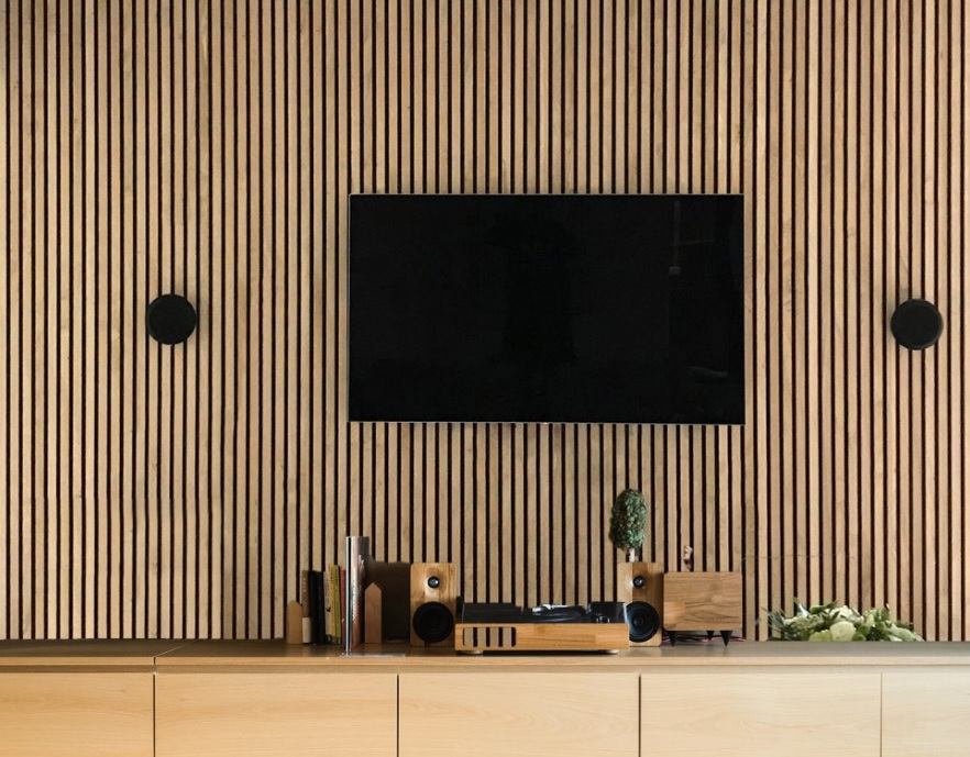• 슬랫의  형상은 하부가 좌우로 파여 흡음보드와 조립 후 동굴처럼 보입니다. 그러므로 슬랫간의 갭으로 들어온 음파는 거의 반사되지 않고  내부에서 소멸하여 공간의 흡음성능을 극대화 시키며, 목재에 부딪힌 소리는 더욱 부드럽게 변하여 클래식 음악등의 청취에 깊은 감흥을  선사합니다.