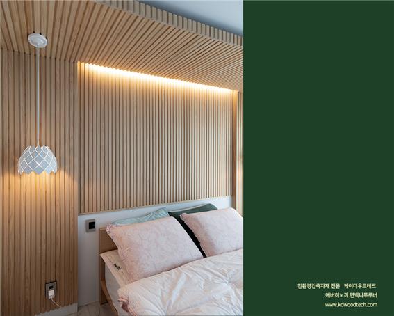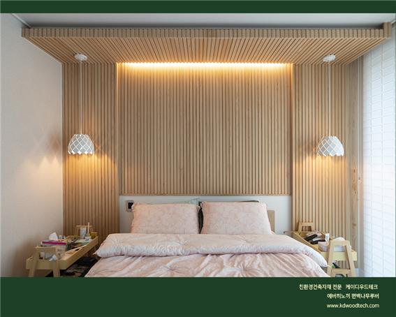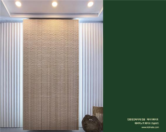 침실인테리어의 해드보드에 적용하게 되면 수면시간 동안 풍부한 피톤치드의 산림욕 효과로 더욱 상쾌한 아침을 맞이할수 있습니다. 또한 현관인테리어 거실인테리어에서도 부담없는 자연의 원목 컬러와 비정형 입체 웨이브 문양으로 예술적인 아트월로서 실내공기 정화와 적절한 습도조절 기능까지 담당하는 아름다운 벽이 가능합니다.