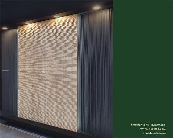 아트월 구성 :  에버히노끼 웨이브 조습보드 + 오동나무 프라임우드 라이너루버 ( 다크그레이  친환경도장, 방염 )