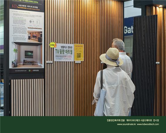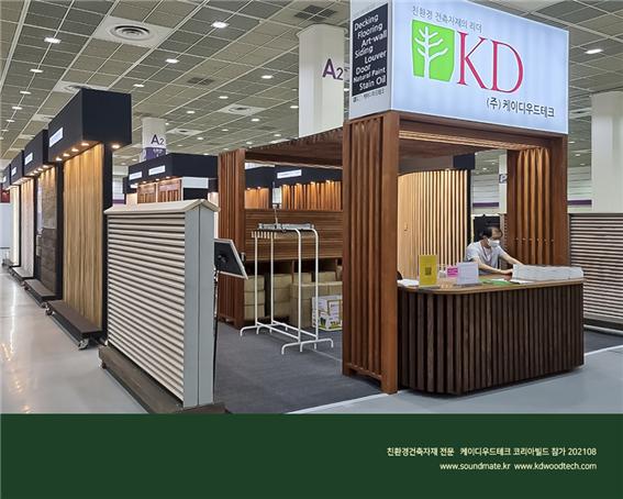 전제품 친환경을 추구하는 ㈜케이디우드테크는 목재 건축자재를 고집하며,건강과 아름다움 그리고 가격까지 고려하여 가장 환영받는 건축자재로 인정 받고 있으며 코리아빌드 건축박람회에 참가하여 관람객의 최고 인기를 모았다. 전국의 건축설계사와 지자체의 안전한 주민시설,주택단지 타운하우스 빌라 개발 업체와 카페등 상업공간에 케이디우드테크의 신기술과 신제품을 파악하기 위해 내방했다. 지속적인 인기를 모으고 있는 탄화목 외장재, 편백나무 무절 원목루버,벽지대신 친환경도장 오동나무 원목루버, 아트월 ,골드우드 데크와 신기술 제품으로서 관리가 필요없고 썩지않는 규화목 데크와 사이딩 , 음향인테리어 사운드메이트는 최고급 인테리어와 외장재로 고객의 관심과 폭증시켰다.