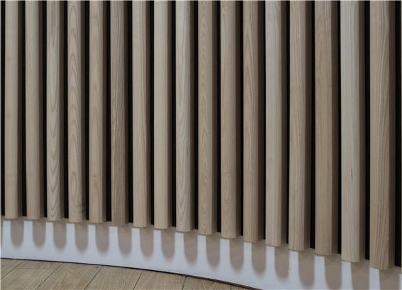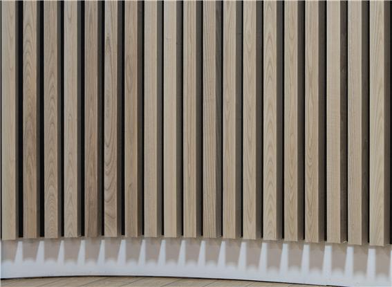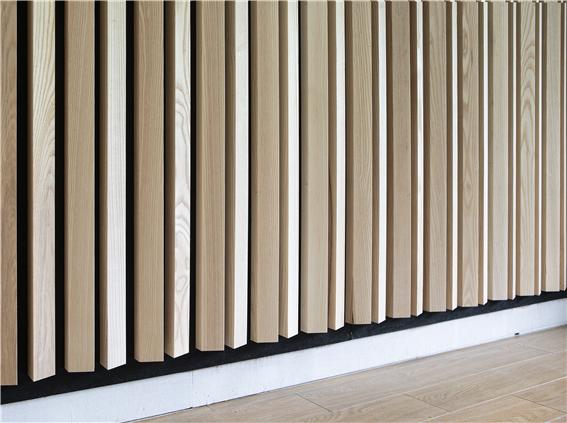 위의 클립루버 시스템은 지속 가능한 재료로 만들어졌습니다. 원목루버( 위의 사진의 경우 애쉬 )는 목재로서 숲의 향기와 피톤치드를 발산합니다. 음향 펠트는 재활용 플라스틱 (주로 플라스틱 병)으로 만들어지며 실내공기를 오염시키지 않습니다. 반영구적으로 사용 가능하며 먼지는 부드러운 빗자루, 진공 청소기 또는 부드러운 천으로 닦아서 청소해주세요.