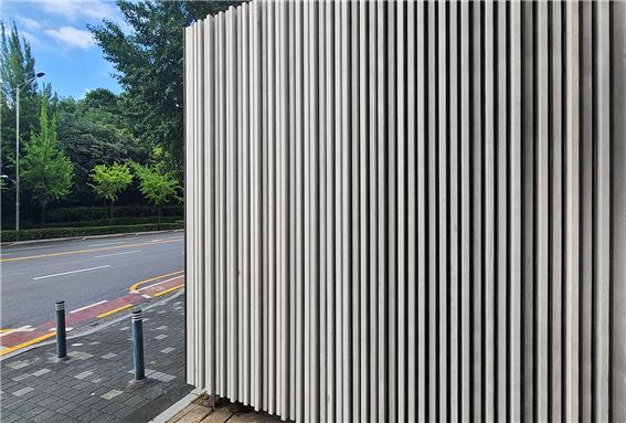 사진은 송파구 오금동 (주)케이디우드테크의 본사 건물 옆에 설치된 KD 어쿠스틱 찬넬리브(방음벽)시스템 : 라왕목재 + ORGANOWOOD 규화제 처리