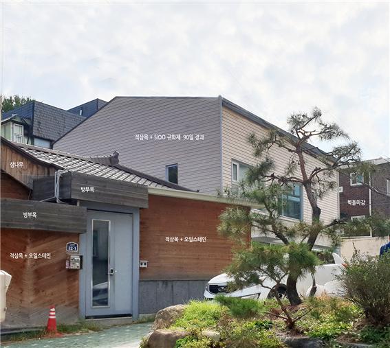 현장 : 종로구 이화장2길 22-3 건축주 직접 구매 후 시공 상가주택 신축 / 적삼목 외장재에 직접 도포