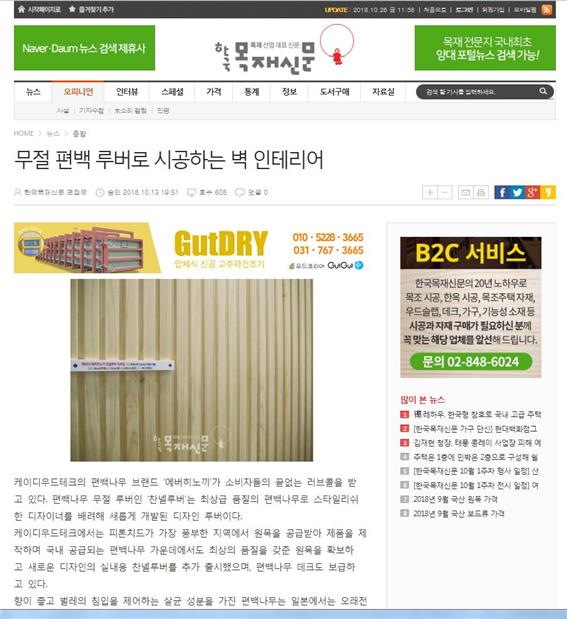 언론보도&광고 [언론보도] [ 목재신문 ] 편백나무 무절 콤보 루버로 꾸미는 실내 공간케이디우드테크, 루버·데크재 출시 2018.10