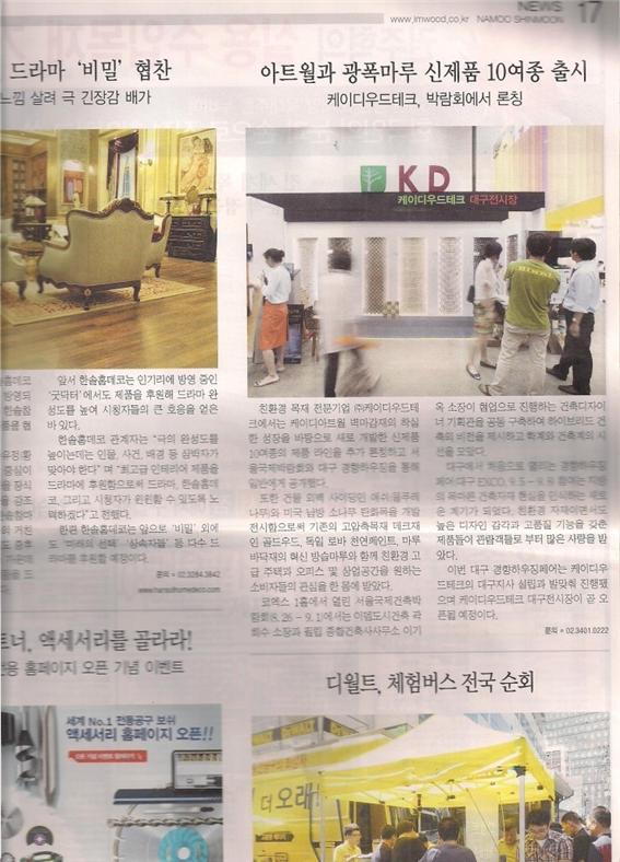 친환경 목재 전문기업 (주)케이디우드테크에서는 케이디아트월 벽마감재의 착실한 성장을 바탕으로 새로 개발한 신제품 10여종의 제품 라인을 추가 론칭하고 서울국제박람회와대구 경향하우징을 통해 일반에게 공개했다.또한 건물 외벽 사이딩인 애쉬(물푸레나무)와 미국 남방 소나무 탄화목을 개발 전시함으로써기존의 고압축목재 데크재인 골드우드,독일 로바 천연페인트,마루바닥재의 혁신 방습마루와함께 친환경 고급주택과 오피스 및 상업공간을 원하는 소비자들의 관심을 한몸에 받았다.