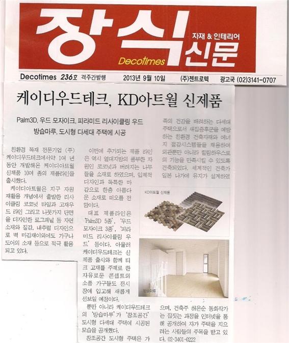 언론보도&광고 [언론보도] 장식신문 기사 (주)케이디우드테크,KD아트월 신제품 2013.9