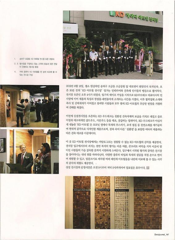 2012년 6월 18일, 평소 한산하던 송파구 오금동 오금공원 앞 대로변이 왠일인지 북적인다. 오픈 30분 전의 ‘KD 아트월 전시장’ 입구는 인테리어와 건축계 인사들의 방문으로 활기차다. 전시장 오픈인 오후4시가 되었다. 입구의 테이프 커팅을 시작으로 KD우드테크 대표이사의 인사말에 이어 제품의 특징과 장점을 내빈들에게 소개하는 시간을 가졌다. 이후 협력업체 소개와 축사 및 건배제의가 이어졌고 참석한 사람들과 모두 함께 KD 아트월의 무궁한 번창을 기원하며 건배를 외쳤다.