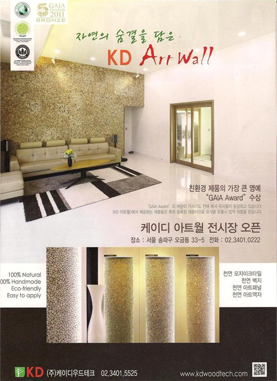 이번에 상설전시장을 오픈하는 KD 우드테크는 친환경 건축자재의 보급을 기치로 내걸고 플로어링과 데크자재인 골드우드, 카본우드 등을 제조, 공급하는 업체이다. KD 우드테크가 야심차게 내놓은 ‘KD 아트월’은 코코넛 열매나 목재의 부스러기, 조개 껍질 등 천연소재를 재가공하여 현대적 감각으로 디자인한 제품으로써, 겉과 속이 다른 ‘친환경’을 표방한 여타의 제품과는 근본이 다른 건축 데코용 마감재이다.