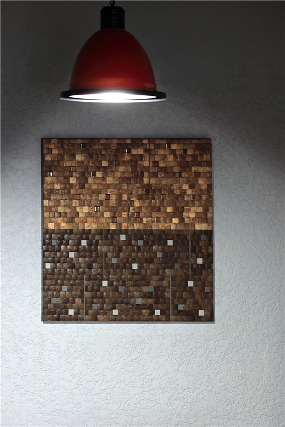 기본적인 목재 모자이크 타일에 세라믹 타일을 랜덤하게 매치시켜 감상의 묘를 더하였다. 액자 형식으로 걸수 있도록 완성하였으며, 원하는 벽면에 쉽게 걸 수 있다. 고급스러운 천연 질감과 디자인으로 주거 및 상업공간 어느 곳에서도 자연스럽게 조화될 수 있다. 집들이, 생일날 등의 특별한 선물로도 적합하다.