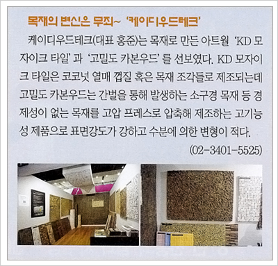 한국목재신문 기사 2011.11.1- 아트월의 신선한 바람 < KD모자이크 타일>아트월의 신선한 바람으로 < 케이디 모자이크 타일> 이 소개되었습니다.