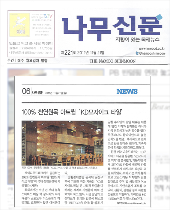 언론보도&광고 [언론보도] 나무신문 221호 News - 100% 천연 원목 아트월 'kd모자이크 타일'천연 목재 타일 'kd 모자이크 타일…