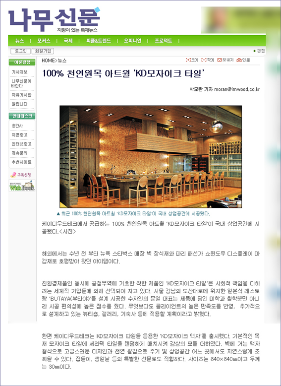 나무신문 221호 News - 100% 천연 원목 아트월 'kd모자이크 타일'천연 목재 타일 'kd 모자이크 타일'이 시공 사진과 함께국내 시공 사례로 처음 소개되었다.