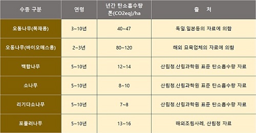 사진3 목재 수종별 이산화탄소흡수량 비교 |