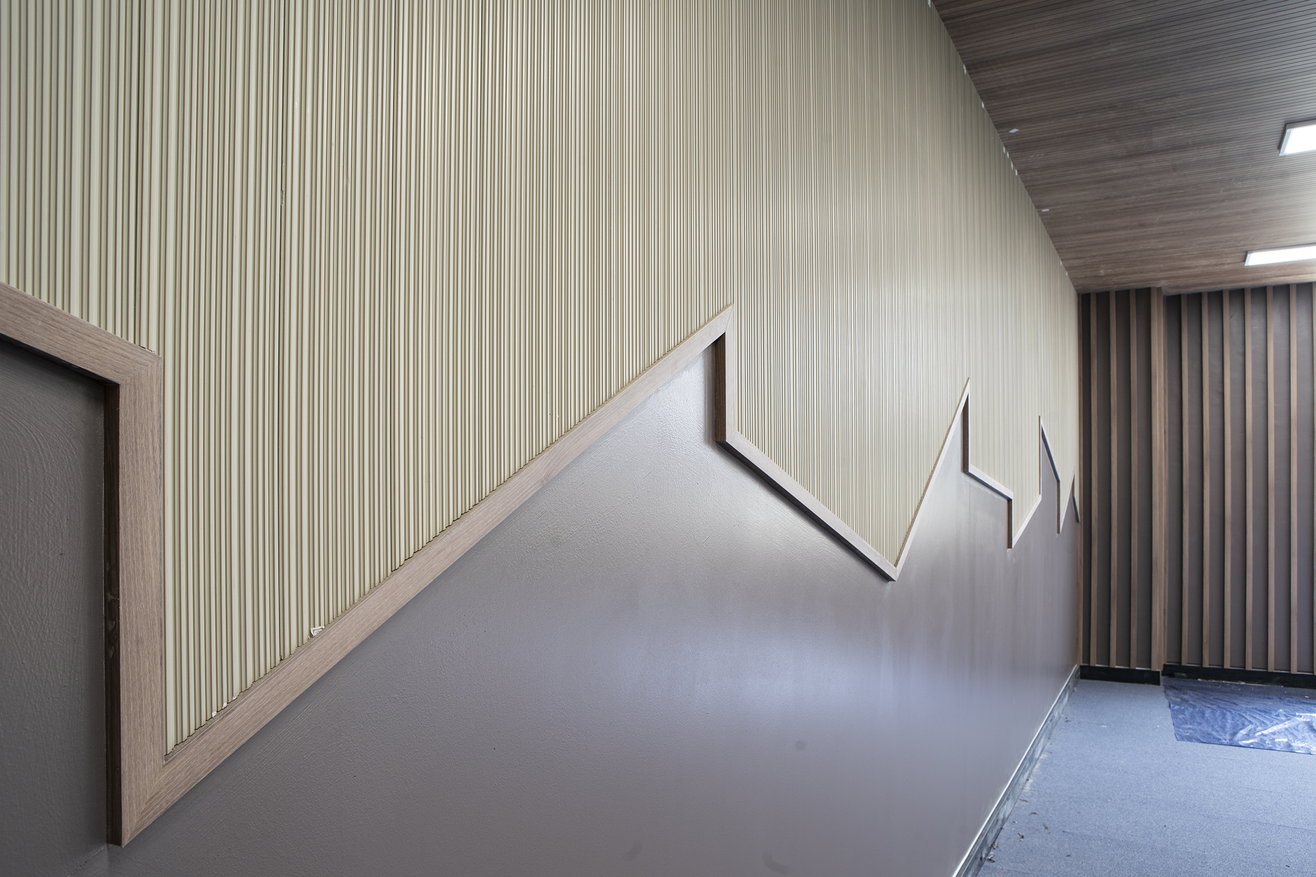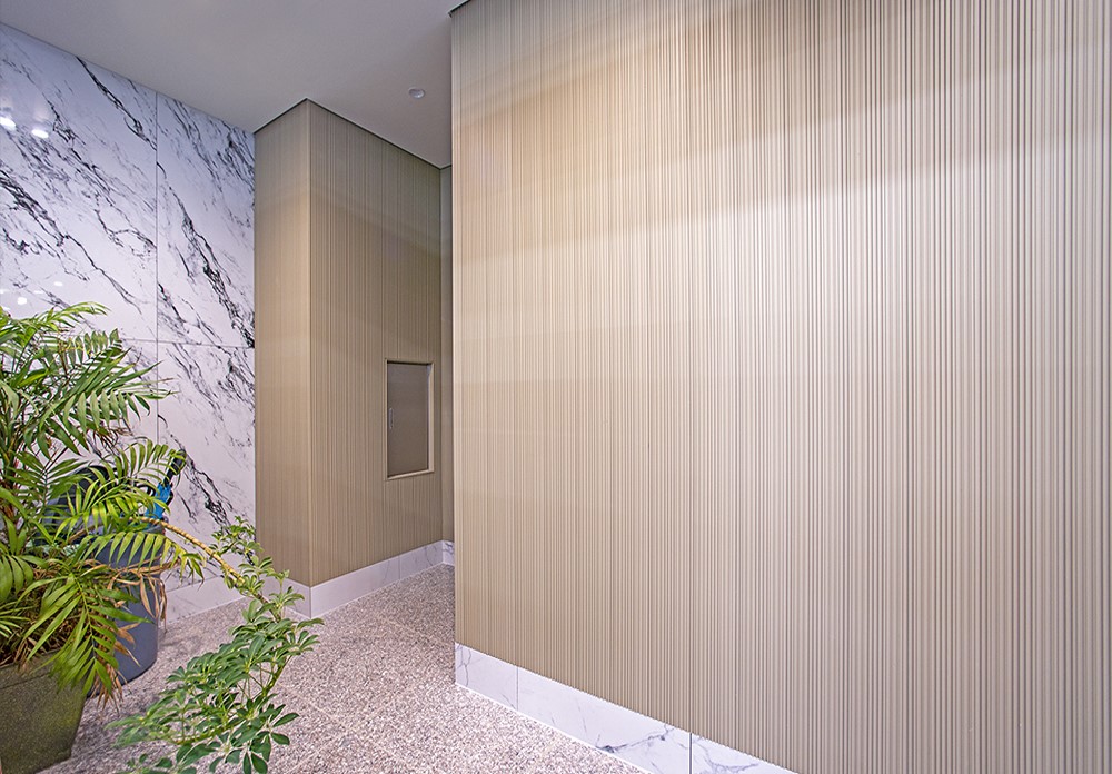 높 낮이와 면 높이가 불규칙한 스트라이프 디자인으로 구성되어 있습니다.. KD프라임우드 라이너 루버는 총 7회의 친환경 도장으로 마감됩니다.